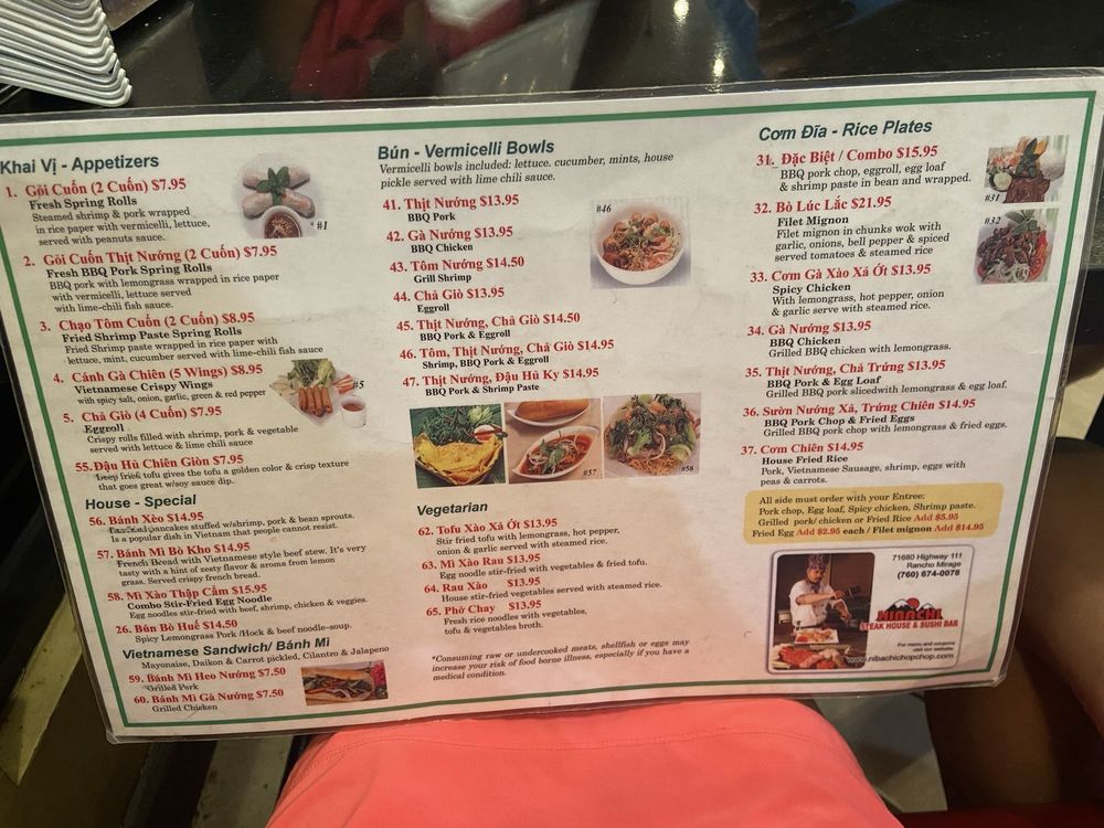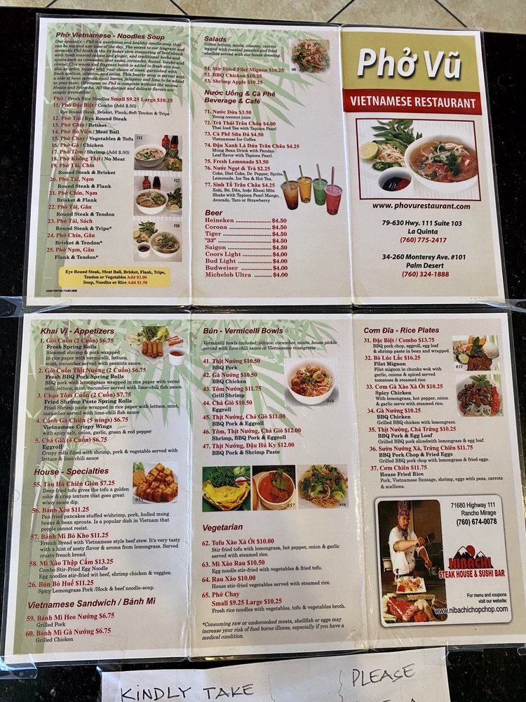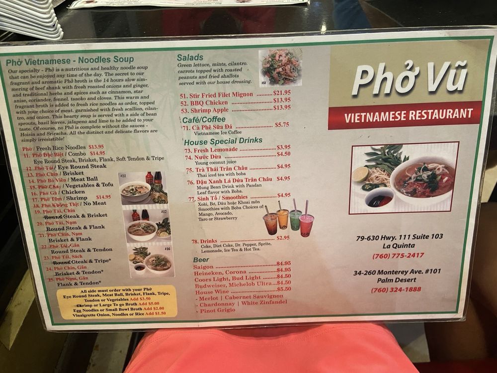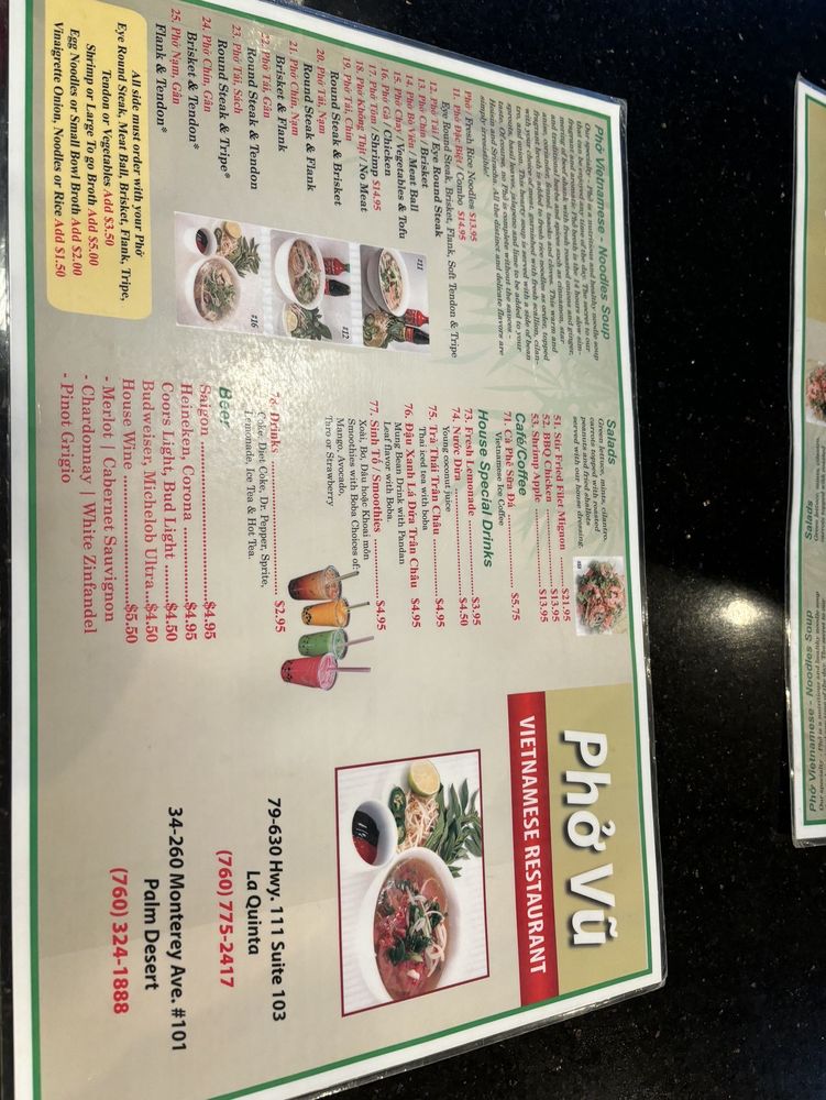 Introducing Pho Vu, a Vietnamese restaurant located in Palm Desert, CA. Known for its authentic flavors and excellent friendly service, Pho Vu offers a variety of dishes including pho, rice plates, banh mi, and appetizers like chicken wings and egg rolls. Customers praise the fresh ingredients, tasty sauces, and generous portions. The warm and inviting ambiance is perfect for a casual dining experience with friends or family. The rich and savory pho broth, perfectly cooked noodles, and flavorful toppings make Pho Vu a standout choice for Vietnamese cuisine in the desert. Whether you're looking for a comforting bowl of pho on a chilly day or a satisfying rice plate, Pho Vu is worth a visit for a taste of delicious Vietnamese fare.